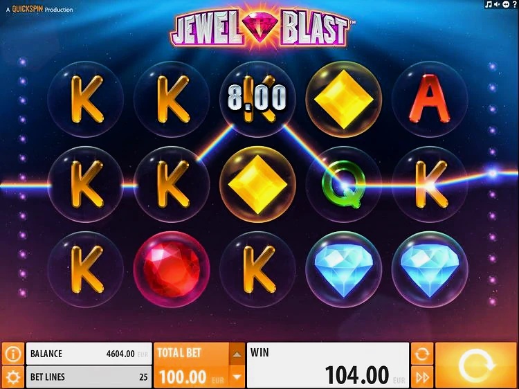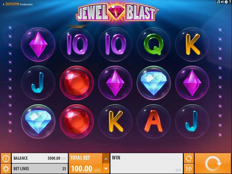 Jewel Blast — это игра от разработчика Betsoft. игровое поле состоит из трех рядов и 25 линий выплат. Задача гемблера — собирать выигрышные комбинации, чтобы активировать бонусные раунды и получать выплаты. Среди символов, за которыми стоит следить — голубая жемчужина, квадратная желтая жемчужина и круглая красная жемчужина, так как при выпадении пяти одинаковых символов вы получите щедрую выплату в размере 50x от общей ставки.