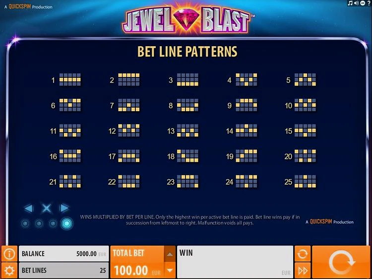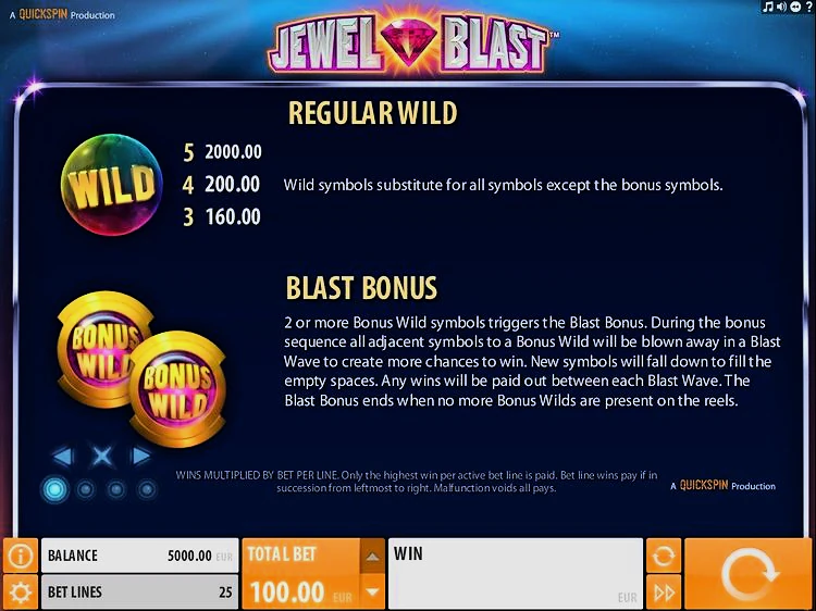 Макет Jewel Blast понятен и экономичен, большинство инструментов, необходимых для игры, расположены в нижней части экрана. В правом нижнем углу находится кнопка вращения, слева от нее — две круглые стрелки, обозначающие функцию автоигры. Нажмите на нее, и появится панель, где вы сможете запустить игру на 1000 последовательных спинов, если пожелаете. В левом нижнем углу находится маленькая кнопка с буквой «I», которая открывает таблицу выплат и дополнительную информацию об игре.