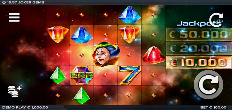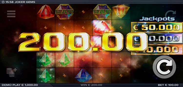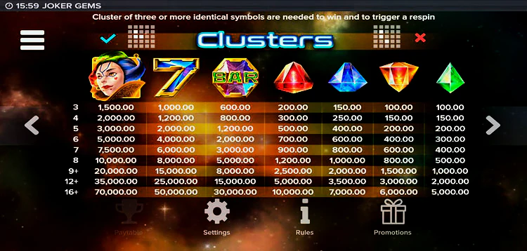 Joker Gems — это слот с кластерными выплатами, то есть в нем нет традиционных линий выплат, а для получения выигрыша необходимо собрать кластер из одинаковых символов. Для получения выплаты необходимо собрать три и более символа. Кластеры могут быть образованы соседними символами в вертикальных, горизонтальных или диагональных рядах.