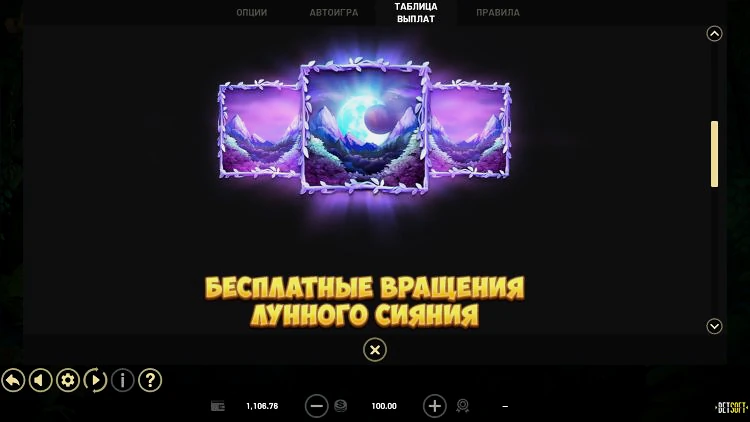 Бесплатные вращения Moonglow запускаются, если на барабанах появляются три или более символа Moonglow. Это дает три бесплатных вращения, которые не могут быть повторно запущены. Символ Moonglow появляется на барабанах 2, 3 и 4.