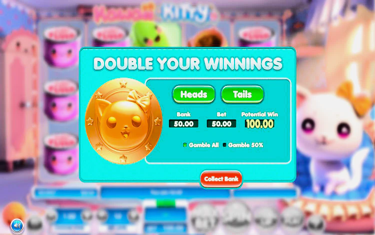 После стандартного выигрышного вращения у вас есть возможность сыграть на удвоение. Это позволяет вам поставить половину или все заработанные за этот раунд деньги на подбрасывание монеты. В этой функции, если вы правильно угадаете бросок, вы удваиваете сумму ставки. В Kawaii Kitty также есть функция автозапуска, при которой можно запросить у игры до 100 вращений от вашего имени.