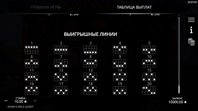 Игровое поле полностью классическое, с 5 барабанами, 3 рядами и 20 линиями выплат. Математическая модель Khan’s Wild Quest имеет высокий уровень волатильности и огромный джекпот в 20,010x.