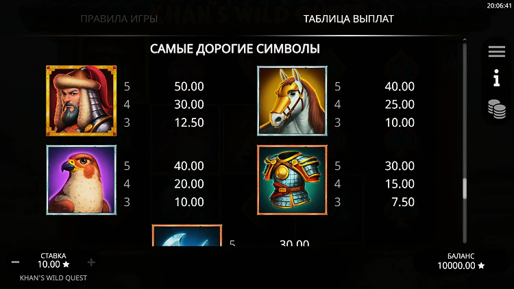 Символы в демо-версии слота Khan’s Wild Quest разнообразны, однако низкие вознаграждения зарезервированы за наборами карт. Однако за полную комбинацию они могут в 2 раза увеличить ставку. В игровом автомате есть алебарды, доспехи, ястребы, лошади и ханы, за которые можно получить крупные награды. Самые высокооплачиваемые символы — это, конечно же, ханы, дающие выплаты в 5 раз больше.