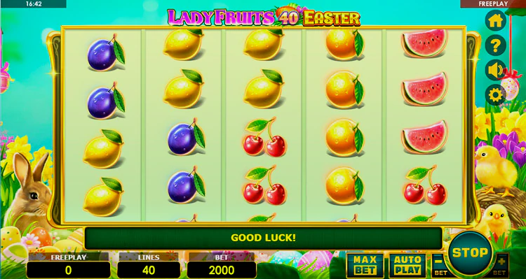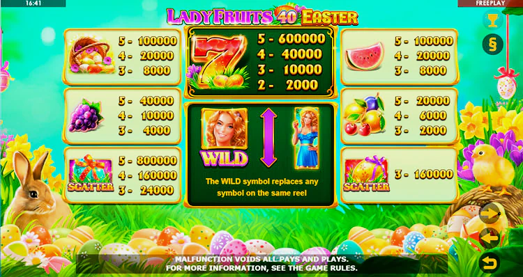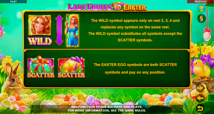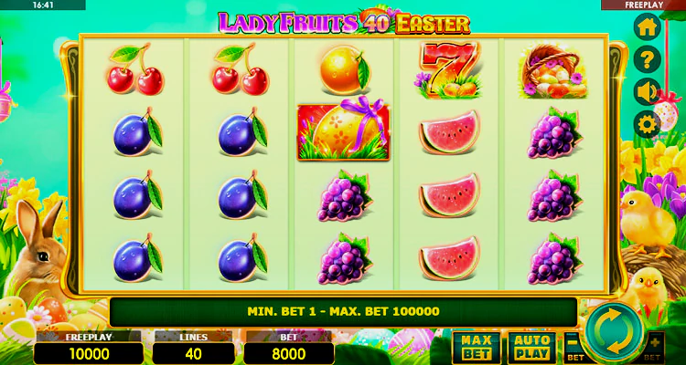 Видеослот Lady Fruits 40 Easter воплощает в своем тематическом оформлении праздничную атмосферу Пасхи. Барабаны расположены на ярком фоне, а внизу — пышная лужайка с зеленой травой, игривыми кроликами и цыплятами. Картина дополнена множеством разноцветных яиц и цветов.
