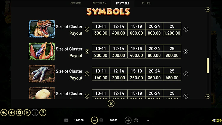 Обратите внимание на иконки с изображением главного динозавра — Тираннозавра. Вы также найдете обитающих в небе птеродактилей, дикий символ вулкана, яйца динозавров и стандартные игральные карты.