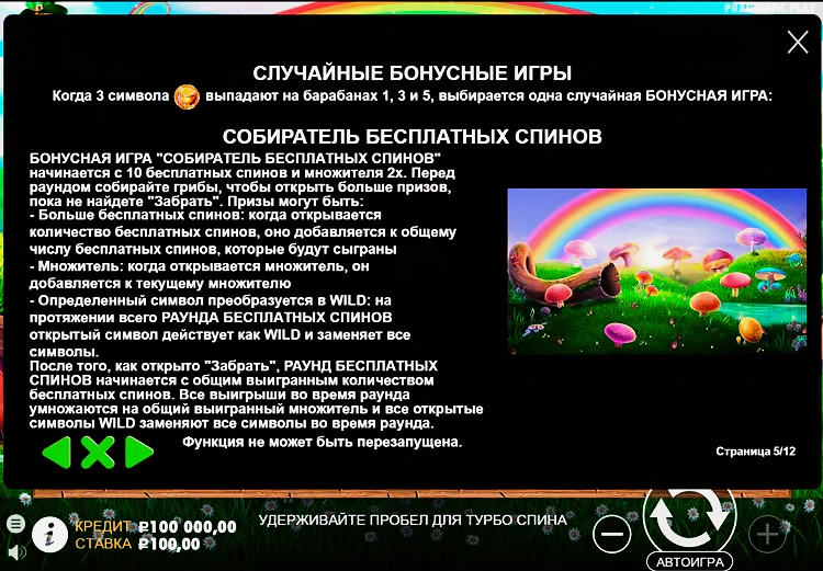 Кроме того, в слоте Leprechaun Song есть специальная бонусная функция, в которой участвует скаттер. Если этот символ появляется на 1, 3 и 5 барабанах, он активирует новую бонусную игру под названием Free Spins Picker, Coin Collector или Giant Symbols. Раунд бесплатных вращений дарит вам десять бесплатных вращений с множителем 2x.