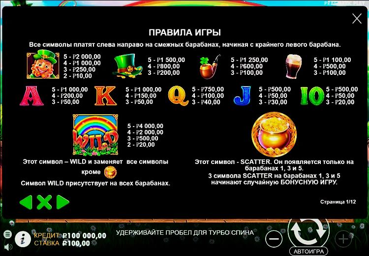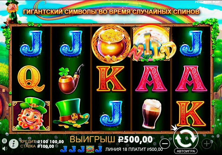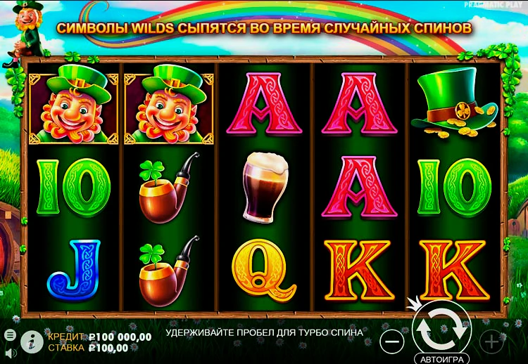 Символы игры включают в себя лепрекона, пинту пива, зеленую шляпу, курительную трубку с четырехлистным клевером, горшок с золотом и радугу.