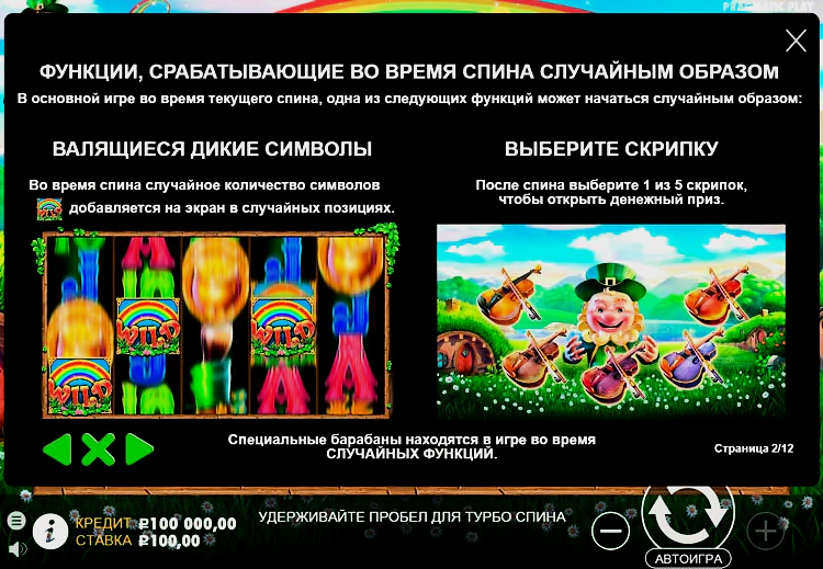 В этой игре есть несколько бонусных функций. Наиболее часто встречающийся символ — радужный вайлд. Когда появляется радужный дикий символ, он заменяет все остальные символы, кроме горшка с золотом, чтобы создать больше потенциальных выигрышных комбинаций. Иногда может срабатывать специальная функция Raining Wilds, которая добавляет на барабаны больше радуг, чтобы увеличить шансы на крупный выигрыш. В этом случае вы также можете принять участие в бонусной игре Pick a Fiddle, в которой вы можете выбрать одну из пяти скрипок, чтобы раскрыть бонусный денежный приз.