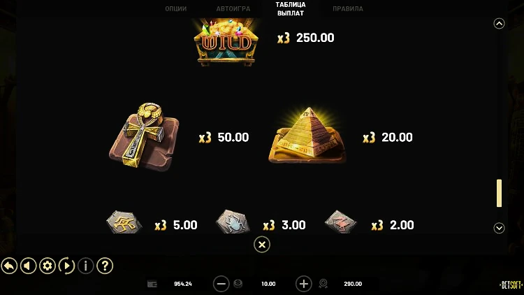 Слот пропитан древнеегипетским и приключенческим духом. Символов немного, но они полностью соответствуют тематике. Выигрыши выплачиваются при выпадении 3 одинаковых символов.