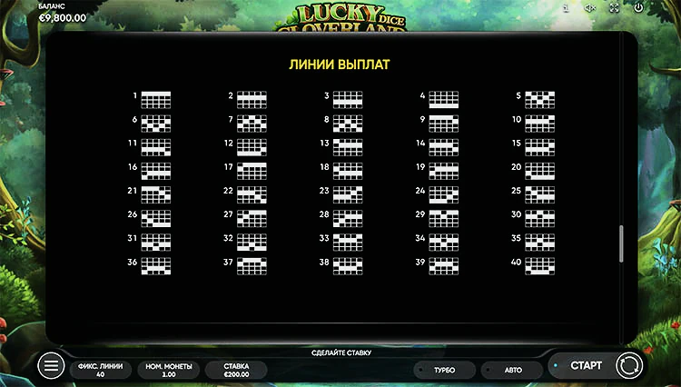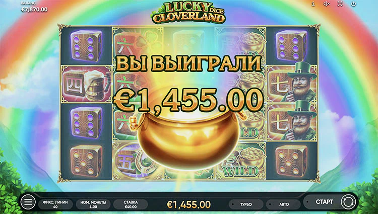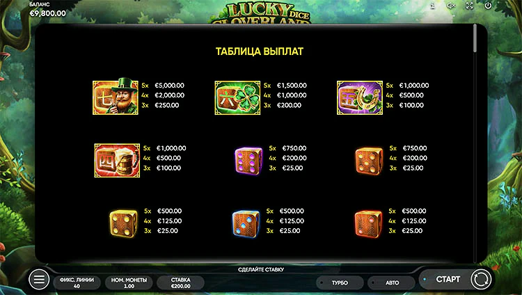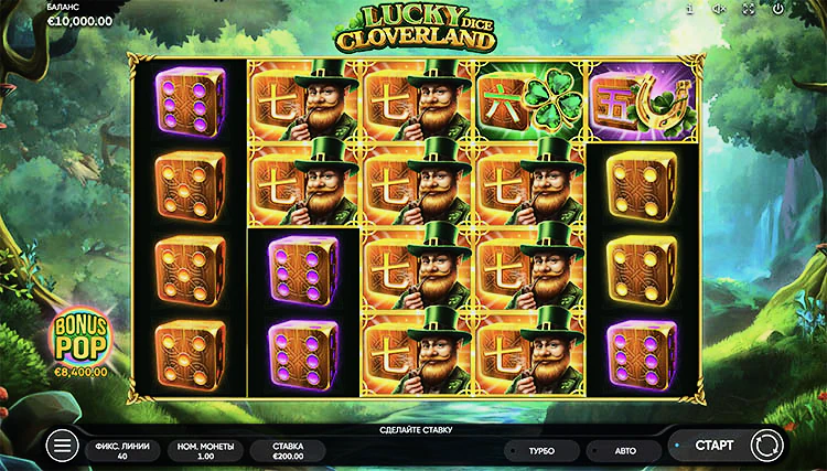 Диапазон ставок в слоте Lucky Cloverland Dice варьируется от 0,40 до 400 кредитов. В купе с высокой волатильностью – игра станет идеальной находкой для хайроллеров. Максвин тоже достойный – 4000х к сумме ставки. Основной механикой игры являются кости, расположенные на центральных барабанах.