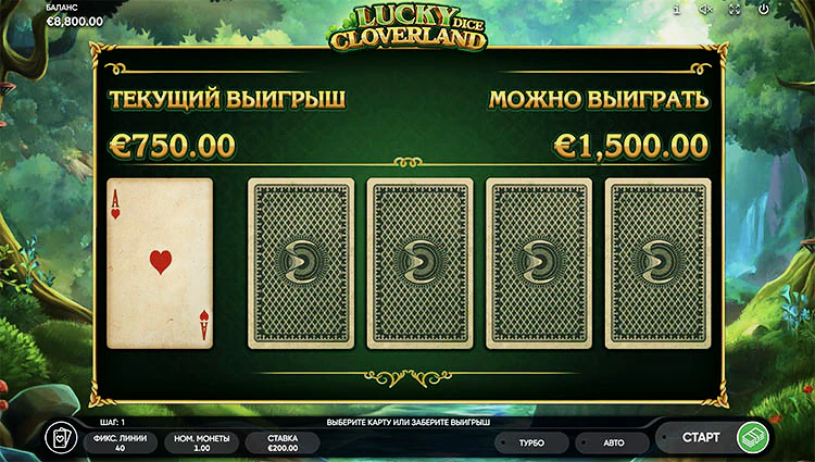 В игровом автомате Lucky Cloverland Dice вы можете испытать свою удачу в риск-игре после каждого выигрыша. В этой игре вам предстоит выбрать одну из четырех карт, чтобы попытаться перекрыть карту дилера. Если ваша карта окажется выше, чем у дилера, ваш выигрыш удваивается. Однако, если ваша карта ниже, чем у дилера, вы потеряете его. Вы также можете решиться на использование функции «половинный риск», позволяющей вам снизить риск, но вместе с ним уменьшится и потенциальный выигрыш.