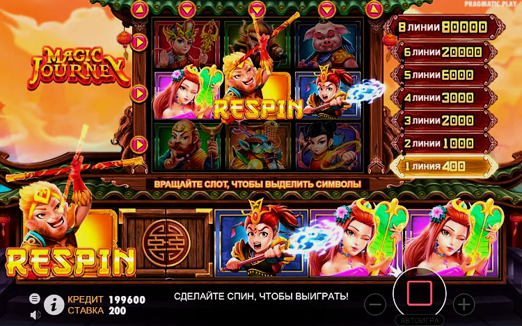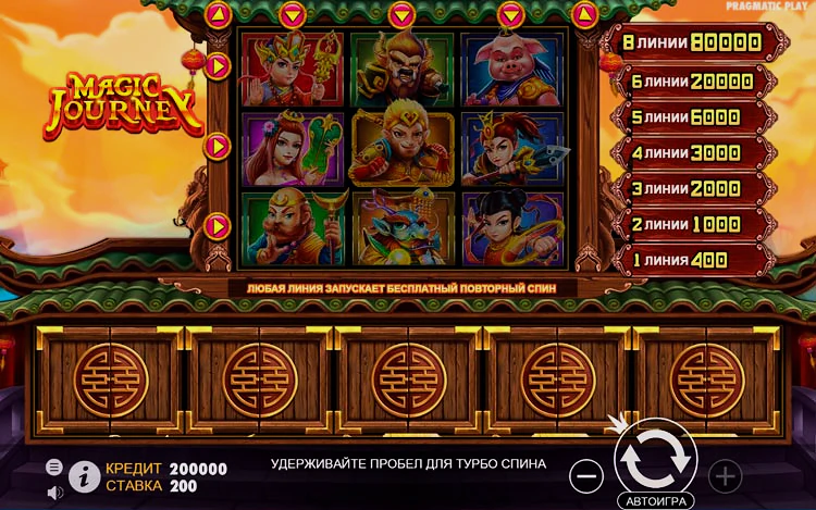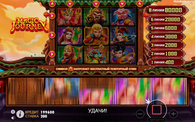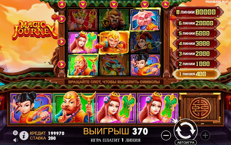 В 2020 году Pragmatic Play выпустила слот Magic Journey, который черпает вдохновение в китайских сказках и фильмах о приключениях в затерянных городах. Слот имеет увлекательный дизайн с живой анимацией и захватывающим звуковым сопровождением. Благодаря 8 выигрышным линиям игроки имеют широкие возможности для создания выигрышных комбинаций при каждом вращении, при этом для получения выплаты требуется минимум 3 одинаковых символа на линии. Сюжет вращается вокруг знаменитого бойца Sun Wukong и разворачивается в китайском храме. Саундтрек дополняет яркое визуальное сопровождение, изображающее легендарных и мифических китайских персонажей.