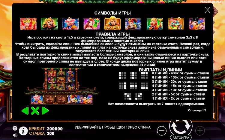 Главная особенность игры — респин, который может быть запущен Королем Обезьян. Во время повторного вращения могут выпасть дополнительные символы, которые в свою очередь выделяют символы на карте счета. Повторные вращения будут продолжаться до тех пор, пока не выпадет символ повторного вращения Sun Wukong или не образуются новые выигрышные линии.