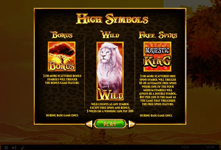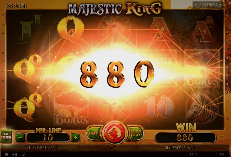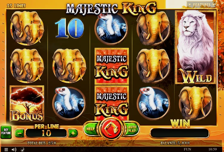 Сегодня вам предстоит оказаться в самом сердце африканской саванны и познакомиться с величественным королем, который правит этими землями! Исследуйте эти дикие тропы и встретьте других подданных его королевства. В слоте Majestic King вас ждут игровое поле 5х3, 25 линий выплат, двойные символы, дополнительные вайлды, 4 вида бесплатных вращений (с теми же двойными символами), опция Buy Feature и отличная бонусная игра. Приготовьтесь к захватывающему приключению, какого у вас еще никогда не было.