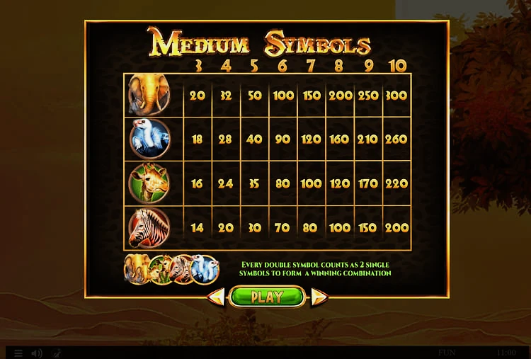 Символы варьируются от изображений слонов и грифов до жирафов и зебр, а также карточные номиналы — от десятки до туза.
