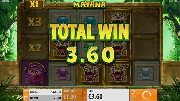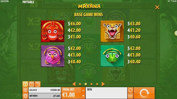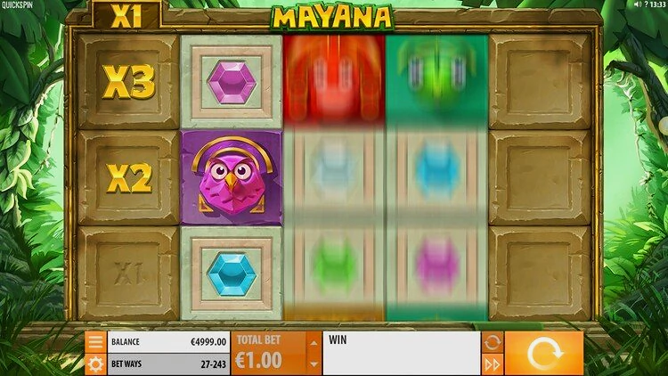Отправляйтесь в древние джунгли майя с Mayana, слотом в мультяшном стиле от Quickspin. RTP игры составляет 96,6%, а игра ведется на сетке барабанов 5 на 3. Игра может показаться карикатурно милой, но не позволяйте теме отвлечь вас: здесь есть 243 различных способа выиграть и множество щедрых бонусных функций, которые можно открыть для себя, вращая барабаны. Среди них — повторные вращения, бонусные символы и множители.