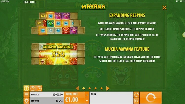 Действие игры происходит в джунглях майя, и при вращении барабанов вы увидите множество драгоценных камней и ярких племенных масок. В стандартной игре 27 выигрышных линий, но это может измениться во время бонусной функции повторных спинов. Эта функция очень щедрая и предоставляет игрокам 23 различных способа выиграть.