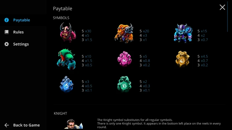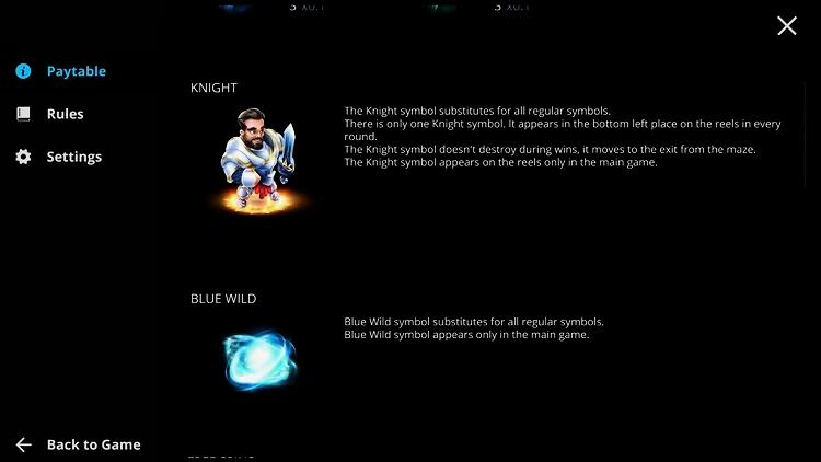 Это символ святого Грааля, который вы хотите заполучить. Рыцарь будет появляться в левом нижнем углу барабанов во время каждого спина. Он может заменять все остальные основные символы. И если вы выиграете, он не уйдет. Просто будет двигаться к выходу из лабиринта, падая, пока не доберется до него.