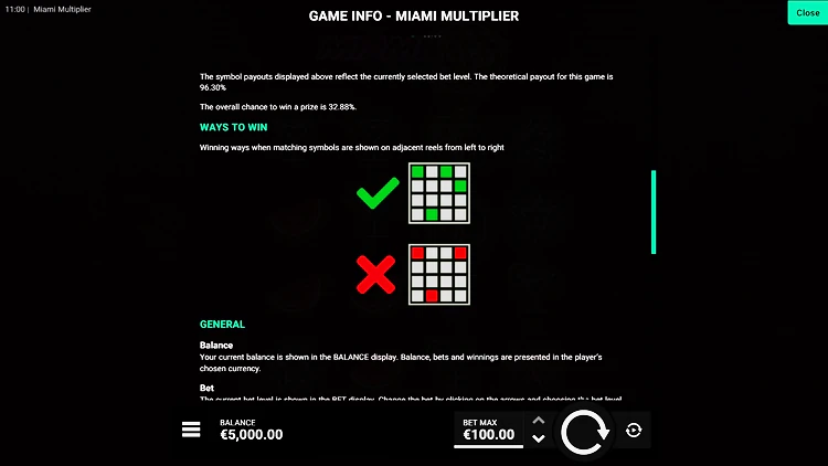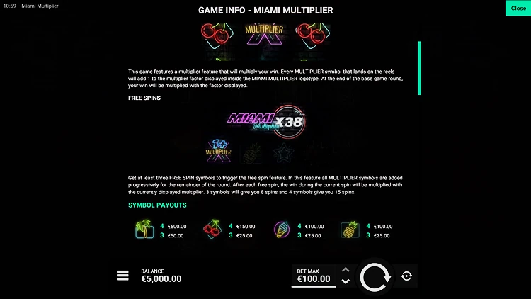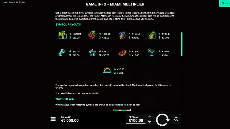 Игроки получат выплату, когда как минимум три одинаковых символа выпадут на последовательных позициях слева направо. Максимальный множитель в игровом аппарате составляет 5.000х, а показатель отдачи игроку равняется 96,30%, что выше среднего показателя RTP, характерного для слотов такого типа. В Miami Multiplier можно играть бесплатно в демоверсии, и это отличный способ изучить механику игрового процесса, прежде чем делать ставки на реальные деньги.