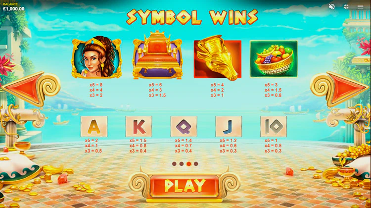Самый ценный символ — дочь царя Мидаса, Зои. Этот символ может умножить любую комбинацию из 3 символов в 2x и 8x от ставки, если вы соберете 5 таких символов. Среди других высокооплачиваемых символов — золотой трон царя, золотой кубок, позолоченная чаша с фруктами и другие. Карточные символы, по классике, самые низкооплачиваемые символы на барабанах.