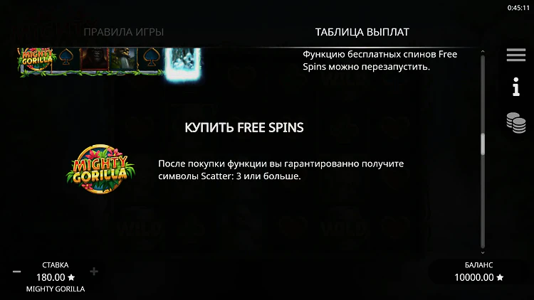 Чтобы активировать раунд бесплатных вращений в слоте Mighty Gorilla, игрокам необходимо поймать 3 или более скаттеров, что даст 8, 12, 16 или максимум 20 бесплатных вращений в зависимости от количества выпавших скаттеров.