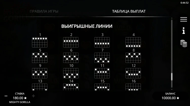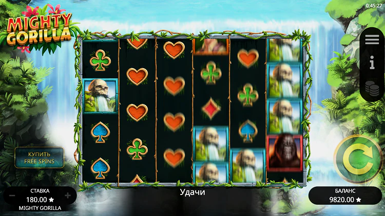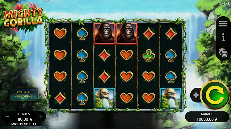 Mighty Gorilla обладает удобным интерфейсом и имеет компоновку игрового экрана 6х4. Элементы управления расположены по обе стороны от барабанов, а кнопка Spin находится на видном месте и оснащена дополнительными опциями для запуска автоспинов.