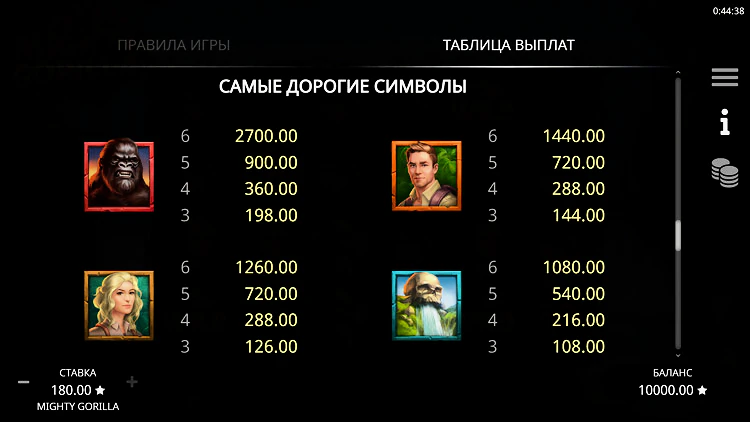 Символы отлично сочетаются с тематикой игры: среди джунглей встречаются бочки с золотом, дикие животных и сама горилла. Символ Mighty Gorilla дополняет тематические элементы, выступая в роли скаттера. Символ гориллы предлагает самую высокую среди основных символов выплату в 13,50х от ставки.