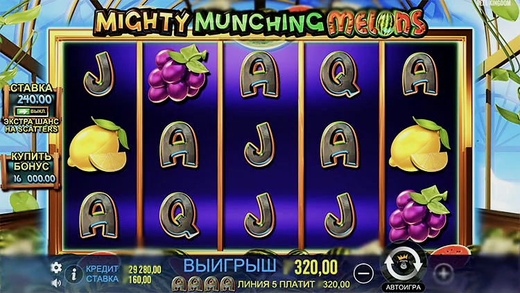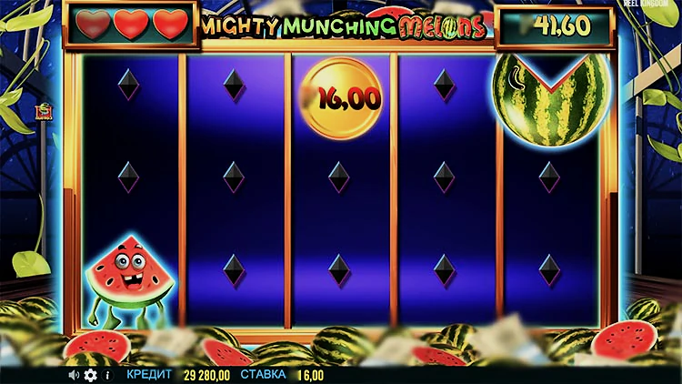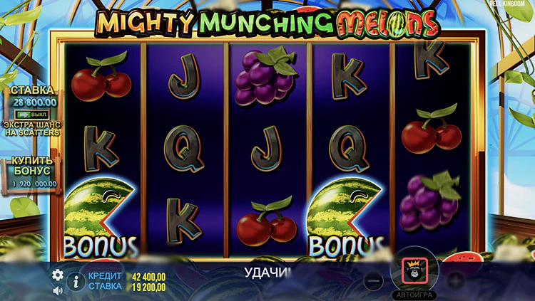 Mighty Munching Melons — дающий видеослот, созданный при коллаборации двух известных студий. Тайтл является совместной разработкой Reel Kingdom и Pragmatic Play, релиз вышел 26 февраля 2024 года. К особенностям слота относят расширенную схему 5х10, максвин на 3000х, режим hold&Win, а также диапазон ставок, расширенный до 360-ти монет.