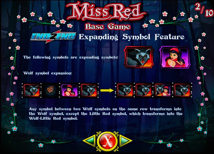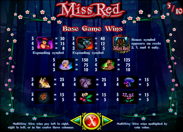 Символы этой игры буду хорошо знакомы тем, кто знает эту историю, а таких абсолютное большинство: сама Красная Шапочка, грозный волк, лесные жители и, конечно же, бабушка, к которой идет Шапочка. В игре также присутствуют специальные символы — скаттеры и вайлды, и стандартные символы с меньшей ценностью. Размер ставки варьируется от одной до двадцати монет на 45 игровых линий.