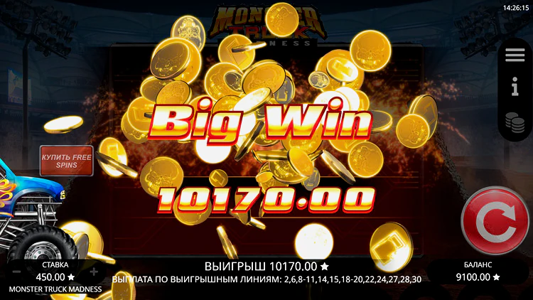 Приготовьтесь к бешеной езде по трассе вместе с игровым автоматом Monster Truck Madness от Booming Games. Это слот с сеткой 6х4 и 30 линиями выплат. Если говорить о дисперсии, то она довольно высока, как и ставки на гонках монстр-траков, а RTP составляет 95,20%. Дикие символы являются частью этой игры, как и символы Bonus, которые приносят бесплатные вращения.