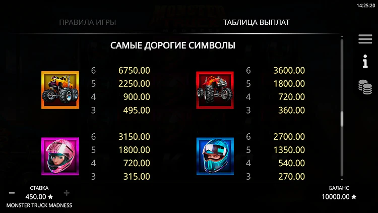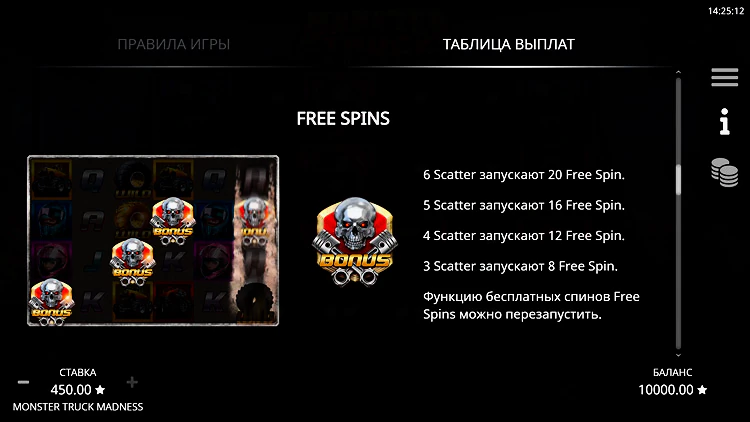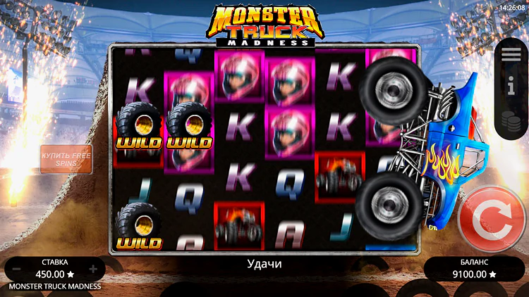 В игре с минимальной ставкой Monster Truck Madness все просто: игрок выигрывает, если совпадают символы слева направо. В сочетании с диапазоном ставок от $0,30 до $450, можно играть новичкам и опытным гемблерам. Ни один слот не обходится без внушительного приза, и в данном случае он составляет 2 500x от ставки, но для этого нужно хорошо изучить символы и функции слота.