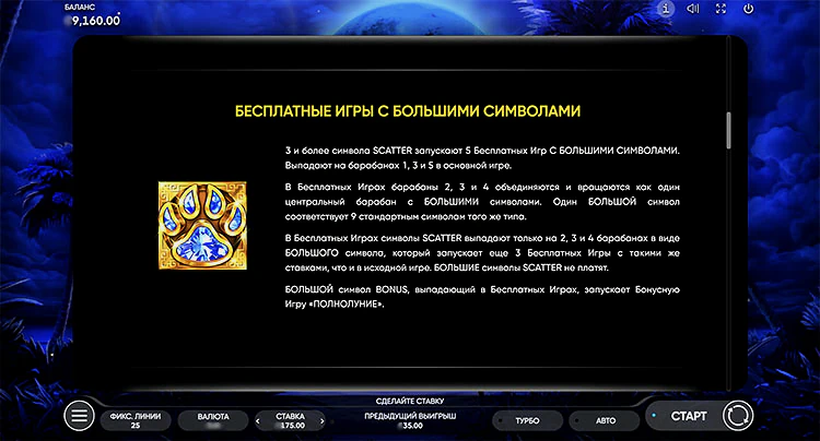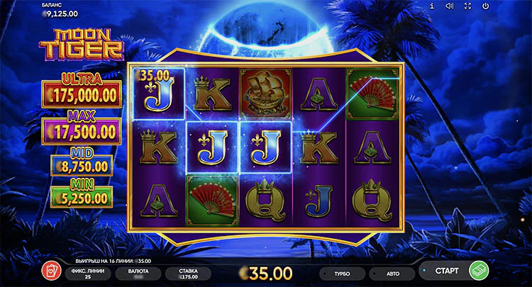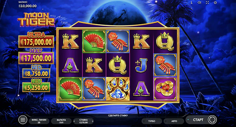 Moon Tiger предлагает 5 барабанов, с 25-ю активными линиями. RTP в размере 96,09% приветствуется, тем более что максвин превышает ставку в 1000 раз. Благодаря сложенным диким символам, скаттерам, бесплатным вращениям и бонусу «JACKPOT» в качестве основных функций, существует множество способов улучшить комбинации базовой игры.