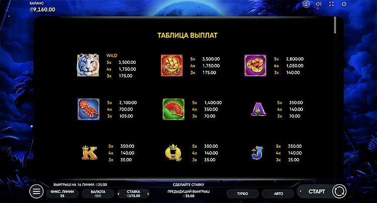 | Лапа тигра (Scatter) | 175 | — | — |