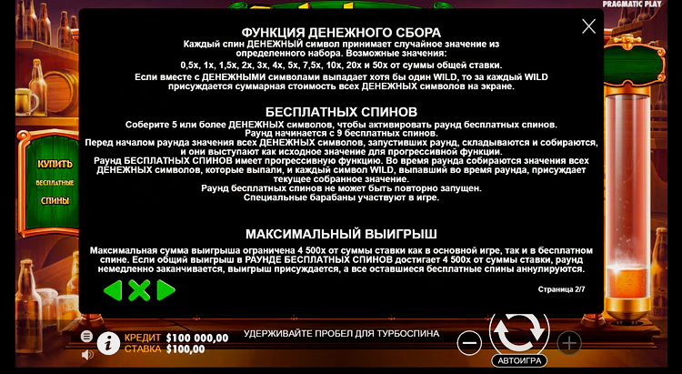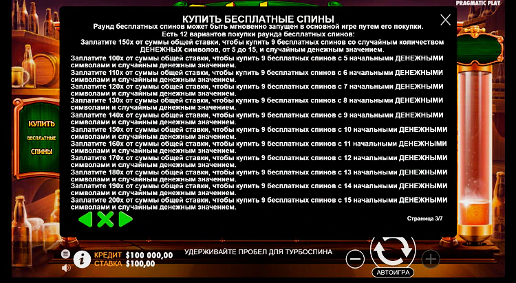 Также, игровой автомат Octobeer Fortunes позволяет покупать дополнительные фриспины во время открутки. Опция buy bonuses появляется только в том случае, если на экране присутствует минимальное количество монет. То есть фриспины можно добирать только для скаттера.