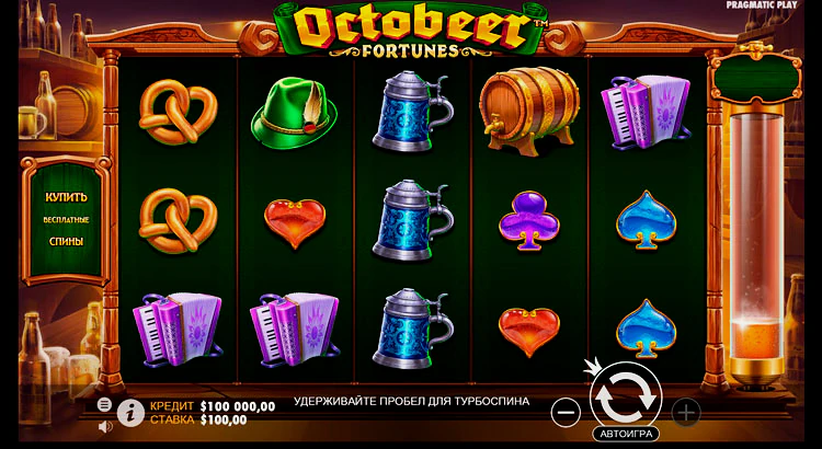 Испытай удачу в тематическом праздничком слоте Octobeer Fortunes от студии Pragmatic Play. Признайтесь, кто бы хоть раз не хотел окунуться в атмосферу популярного европейского пивного фестиваля? Игровой автомат Octobeer Fortunes позволяет вам исполнить эту мечту, не вставая с дивана. Вам потребуется только 20 центов на минимальную ставку. Приятная музыка, красивые девушки в тематической одежде, пивные кружки, всевозможные закуски и, конечно, кураж от победы!
