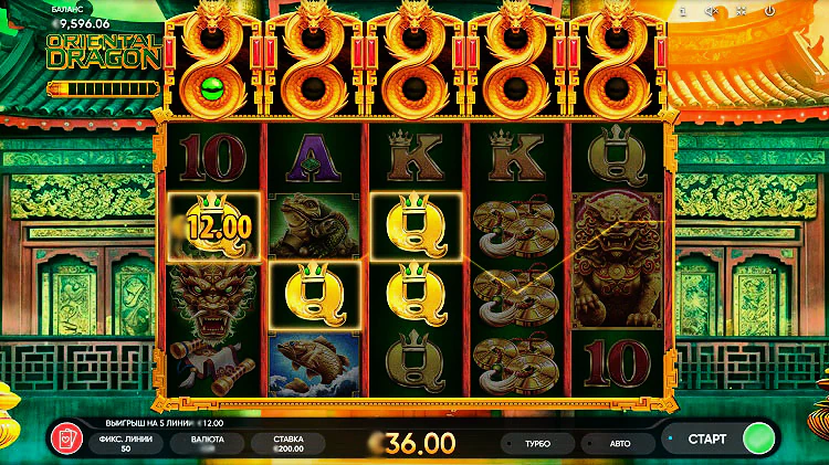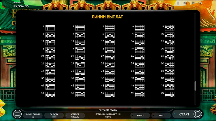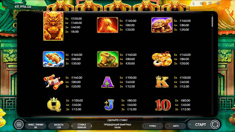Игровой автомат имеет низкую дисперсию, есть максвин при выпадении 3х вайлдов составляет 800х от суммы первоначальной ставки. Здесь есть демонстрационный режим, функция автоматического запуска и адаптация софта под мобильные устройства. Слот обладает классической структурой с пятью барабанами и тремя рядами, на которых можно образовывать выигрышные комбинации по 50 активным линиям выплат. Этот игровой автомат предлагает разнообразные символы, включая изображения драконов, китайских монет, японских вееров и других элементов восточной культуры.