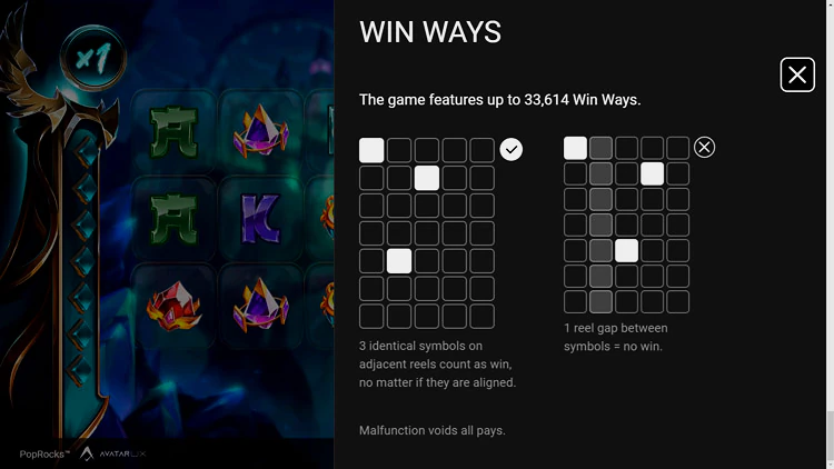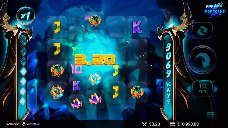 Игровое поле разлиновано стандартно — 5х3, однако в видеослоте предусмотрена возможность расширения до 7 рядов. Линий выплат 486, но они также увеличиваются аж до 33.614 при расширении рядов в бонусной функции PopWins. Чтобы получить выигрыш, гэмблеру необходимо дождаться составления цепочки из 3-5 одинаковых символа слева направо. В одном спине допускается сразу несколько цепочек.