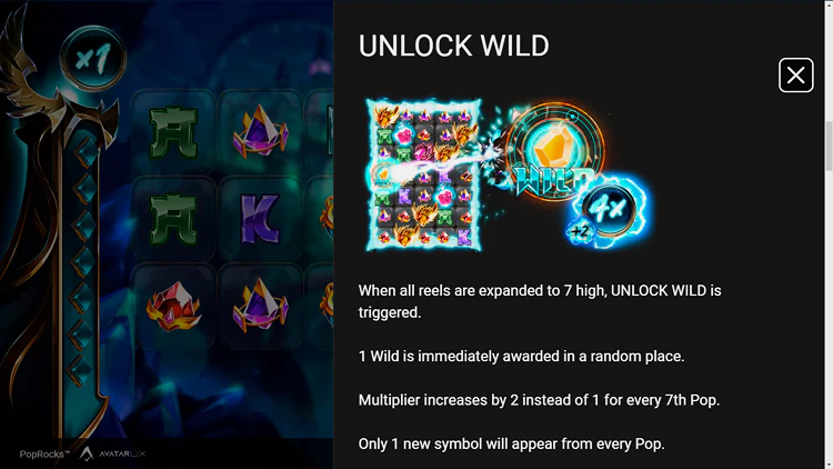 2. Unlock Wild – этот режим несколько сложнее. Чтобы в него попасть, нужно дождаться, когда поле расшириться и на нем будет по семь картинок в ряду. В этом случае появляется джокер и дополнительные множители, принося большой куш.