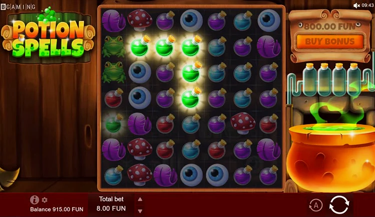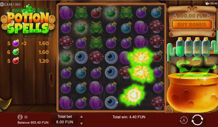 Слот Potion Spells оснащен 7-ю барабанами и высокой отдачей (96,2%). Игрокам предоставляется возможность выиграть при сочетании трех или более одинаковых символов на активной линии выплат. Аппарат можно активировать бесплатно и без регистрации, воспользовавшись демонстрационным режимом. Тайтл имеет современное юзабилити и быстро загружается как на десктопе, так и на смартфонах, поддерживая софт платформы HTML5.