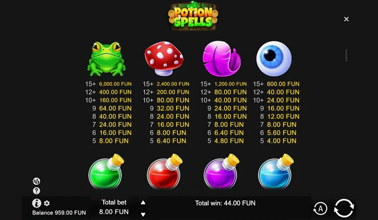 Основные символы игрового автомата Potion Spells имеют разную стоимость в зависимости от комбинации. Вот их возможные выплаты в монетах за соответствующее количество символов на активной линии: