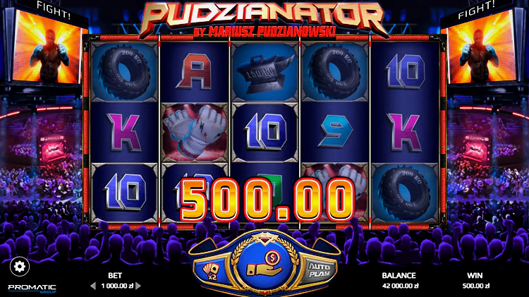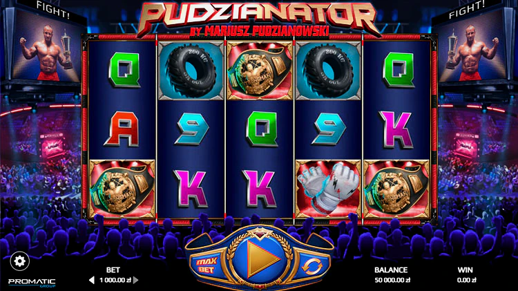 Представляем вам дебют Мариуша Пудзяновски, известного как «Доминатор» или «Пудзян» — PUDZINATOR. Создателем данного софта является самый сильный человек в мире, он занесен с таким титулом в Книгу рекордов Гиннеса. С 2009 года Мариуш выступает бойцом ММА. Игра богата на яркие бонусы, среди которых Биг Вин, Хьюдж Вин и Мега Вин, что означает большую сумму выигрыша. Особенностью этого слота является наличие опции гэмбл, суть ее в том, что геймблер должен угадать отправит ли Пудзиан в нокаут своего соперника?