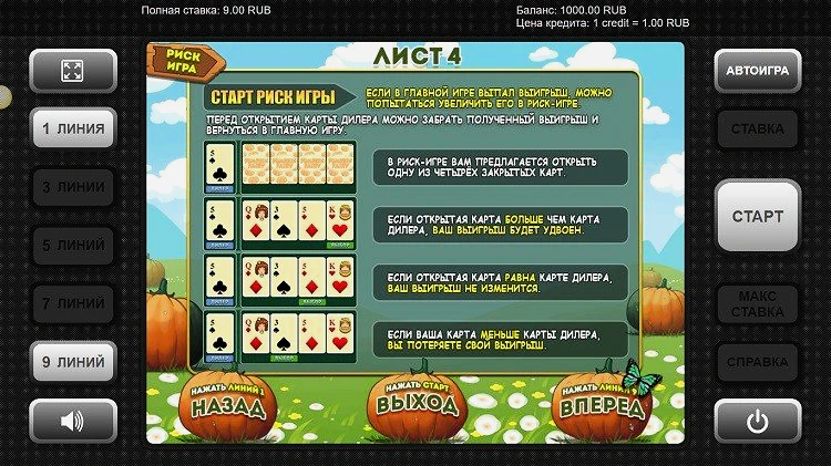 Азартный игрок может активировать риск-игру на любом выигрышном спине в демо-версии слота Pumpkin Fairy. Это стандартная функция азартной игры. Здесь игрок должен выбрать карту, после чего игра выбирает карту. Если обе карты одинакового достоинства, игрок получает свою ставку обратно. Если карта игрока имеет большее значение, его выигрыш удваивается. Если карта меньшего достоинства, он теряет все.