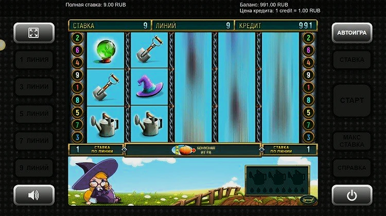 Самым высокооплачиваемым символом является логотип слота. Он выплачивает 200, 1 000 или 5 000 кредитов, если выпадает на барабанах одновременно три, четыре или пять раз соответственно. Следующий высокооплачиваемый символ — волшебная палочка, умножающая начальную ставку в 100, 500 или 2 000 раз. Она также представляет собой дикий символ, который может заменить все остальные значки, появляющиеся на барабанах. К базовым символам относятся: книга заклинаний, лейка, хрустальный шар, сумка, шляпа колдуньи и лопата. Сама колдунья на барабанах не появляется, но ее фигура на фоне зеленой лужайки всегда присутствует под игровым полем.