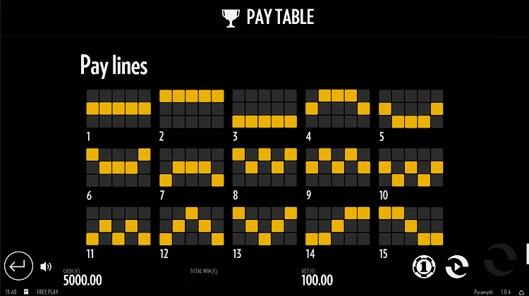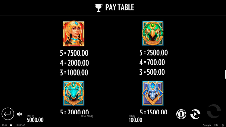 Если говорить о таблице умножений, то джекпот может достигнуть размера 10 000 монет от максимальной ставки. Все коэффициенты можно обнаружить в информационном разделе аппарата Pyramyth. Тут будет проще ознакомиться с актуальными множителями, а также всеми дополнительными функциями тайтла.