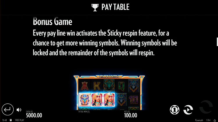 Еще в тайтле есть scatter. Появление 3 картинок с надписью Bonus запускает фриспины. В зависимости от числа скаттеров, варьируется и количество таких вращений. В бонусном раунде Pyramyth действуют дополнительные умножения. Тут при каждом выпадении Wild-элемента срабатывает опция респина. Сыгравшая комбинация остается, и может быть дополнена соответствующими символами.