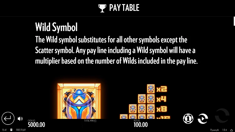 Конечно, предлагаются и дешевые символы в виде игральных карт. Кстати, разработчиком Pyramyth предусмотрен и Wild элемент. Его роль в аппарате выполняет жук скарабей. Любые дикие символы на поле могут заменить недостающие ячейки в комбинации.