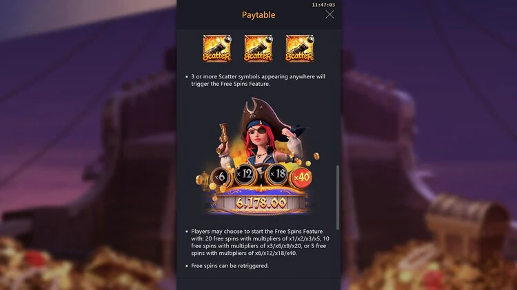 В игре также предусмотрен Scatter-символ, который запускает бесплатные спины. Собрав 3 таких символа, вы можете выбрать тип бесплатных спинов. Выбор варьируется между 20 спинами с множителем до 5x, 10 спинами с множителем до 20x или 5 спинами с множителем до 40x.