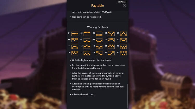 - Линии выплат. В игре Queen of Bounty представлено 20 фиксированных линий, что обеспечивает обширное количество возможностей для создания комбинаций при каждом вращении барабанов, что типично для подобного рода автоматов. Для получения выигрыша необходимо собрать минимум 3 символа по одной из линий.