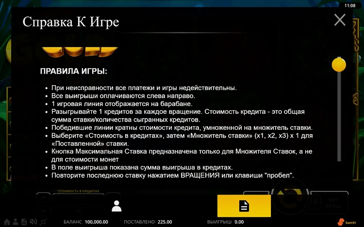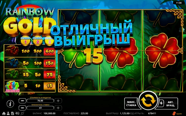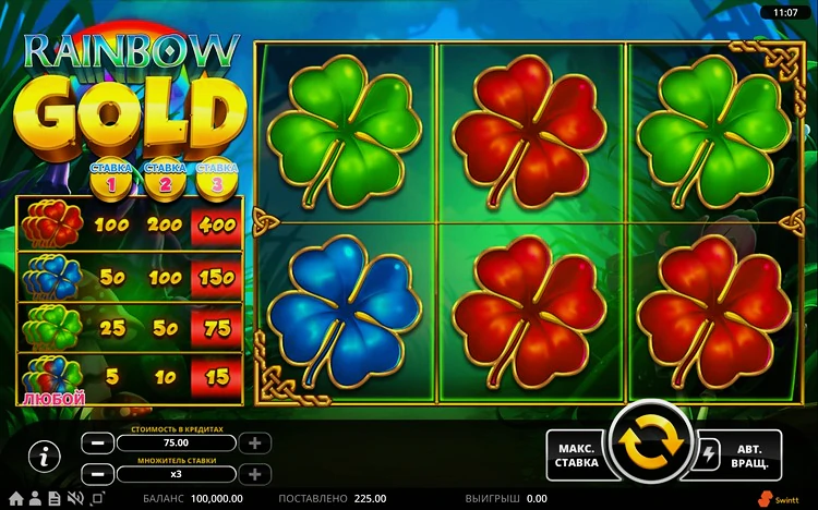 Игровой автомат Rainbow Gold предлагает сделать минимальную ставку всего на 20 центов. Максимальная сумма, доступная для покупки спина – 125 долларов. У аппарата довольно неплохой процент отдачи – 96,4. Максимальный множитель – 4000х. Если вам удалось добраться до него, игра будет остановлена, а вы получите выплату по расчету.