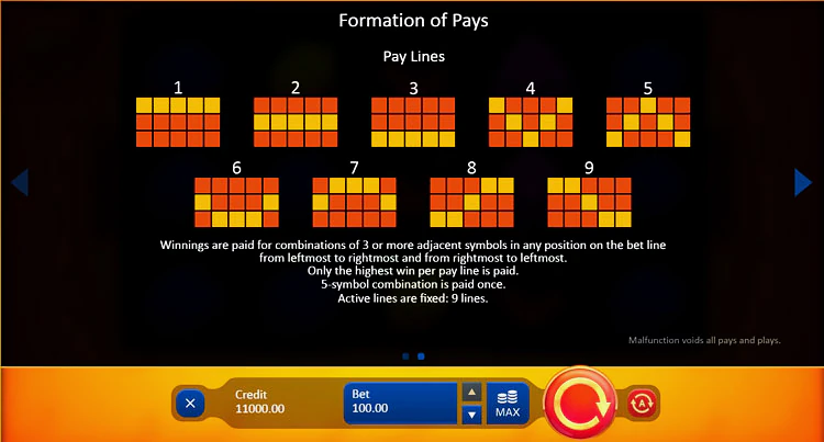 Чтобы выиграть денежный приз, вам нужно совместить три или более символов на одной линии выплат. Сопоставляйте символы слева направо или справа налево, так как в этой игре действует механика выигрыша Pays Both Ways, что делает ее больше похожей на 18-линейную игру, чем на 9-линейную. Денежные вознаграждения выплачиваются в зависимости от количества совпадений в кратном размере от общей ставки следующим образом:
